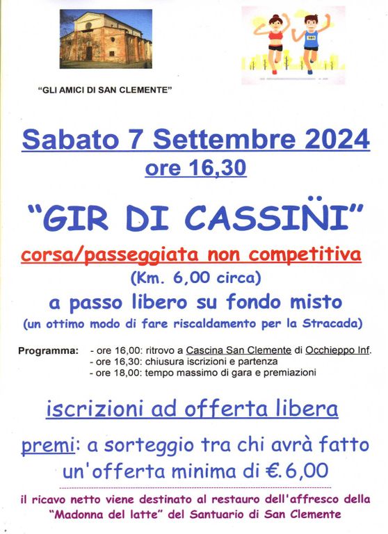 A Occhieppo Inferiore sempre sabato 7 settembre c'è il "Gir di Cassini" una corsa passeggiata non competitiva di 6 km circa a passo libero su fondo misto. Il ritrovo è a Cascina San Clemente alle 16, alle 16,30 c'è la chiusura delle iscrizioni e la partenza. Il ricavato sarà utilizzato per il restauro dell'affresco della Madonna del Latte del santuario di San Clemente. A organizzare la corso sono gli Amici di San Clemente.