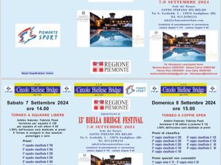 Il 7 e l’8 settembre si terrà a Biella il 13° Biella Bridge Festival, un'importante manifestazione dedicata agli appassionati di bridge. L'evento si svolgerà nella suggestiva cornice del Relais Santo Stefano di Sandigliano e si preannuncia come uno degli appuntamenti più attesi nel panorama bridgistico regionale.
