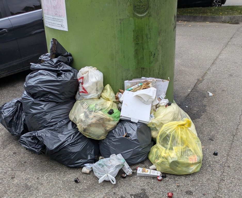 La foto è stata scattata alla campana del vetro nel parcheggio accanto a San Biagio e ITIS, costantemente coperta di rifiuti così come succede in altri punti della città.