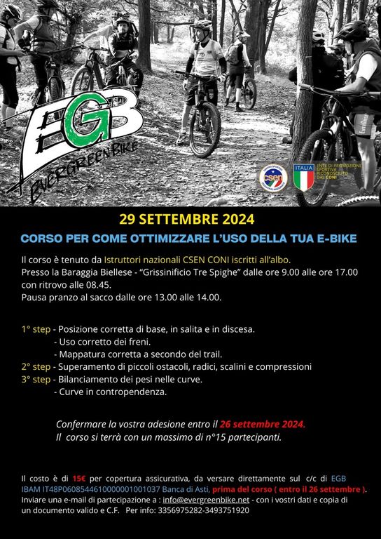 Il 29 settembre 2024, gli appassionati di e-bike avranno l'opportunità di partecipare a un corso dedicato all'ottimizzazione dell'uso delle biciclette elettriche. Organizzato dall'associazione Evergreen Bike presso la suggestiva Baraggia Biellese (Grissinificio Tre Spighe), l'evento sarà condotto da istruttori nazionali CSEN-CONI iscritti all'albo, con un programma che si estenderà dalle 9:00 alle 17:00, con ritrovo alle ore 08:45.