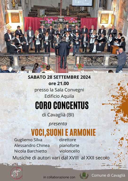 A Cavaglià è tempo di ascoltare il Coro Concentus, in programma sabato 28 settembre, alle 21, presso la Sala Convegni dell'Edificio Aquila. Verranno realizzare musiche di vari autori.