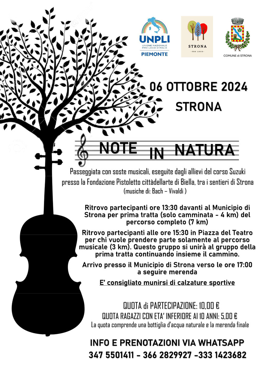 Domenica 6 ottobre Strona rivive l'evento "Note in natura", una passeggiata con soste musicali, eseguite dagli allievi del corso Suzuki presso la Fondazione Pistoletto Cittàdellarte di Biella, tra i sentieri di Strona.