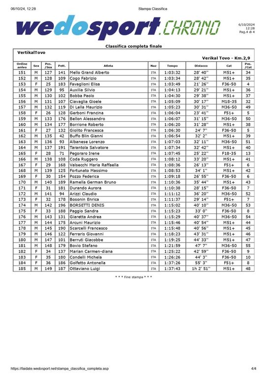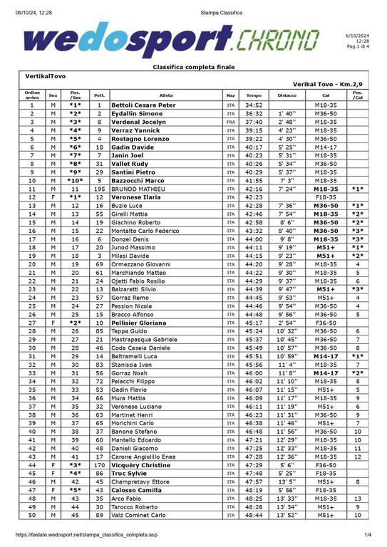 Inoltre, questa edizione è stata contrassegnata dal primo anno di gemellaggio tra il Vertikal Tovo e il Vertical Tube di Villeneuve (in Valle d’Aosta), in agenda il prossimo 3 novembre e dalle caratteristiche tecniche molto simili, come confermato da Vigitello.