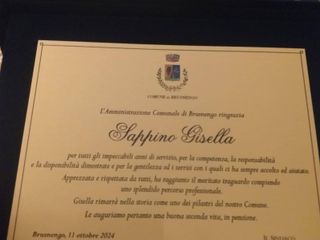 “Gisella rimarrà nella storia come una dei pilastri del Comune, che ci ha sempre accolto con sorrisi e gentilezza. Vogliamo ringraziarla per tutti gli anni di glorioso servizio, competenza e responsabilità. Tanti sindaci e tante elezioni ha visto passare.. Goditi la meritata pensione cara Gisella! Tutti i Brusnenghesi ti saranno riconoscenti per i tuoi impeccabili anni di servizio”.