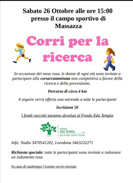 E’ Ottobre Rosa anche a Massazza, dove sabato 26 ottobre, alle 15, con partenza dal campi sportivo del paese, ci sarà ”Corri per la ricerca”, una camminata/corsa benefica aperta ad ogni età, con i partecipanti invitati ad indossare una maglietta rosa.