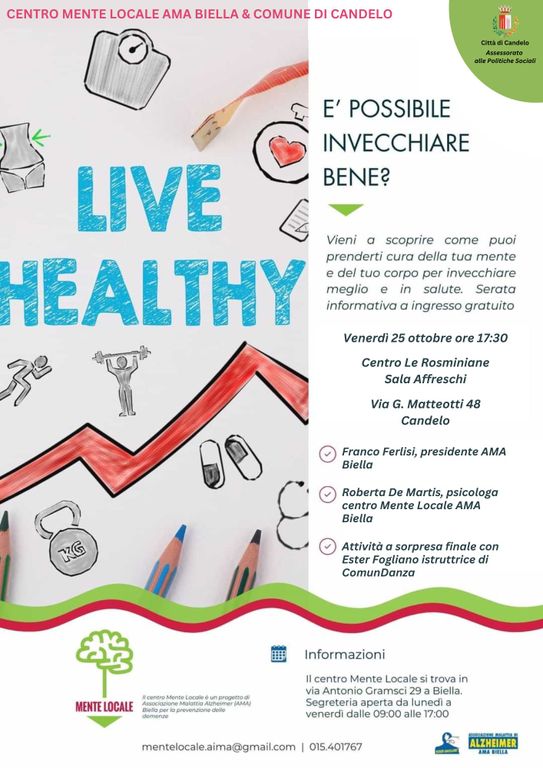 L'Assessorato alle Politiche Sociali del comune di Candelo, in collaborazione con l’Associazione Italiana Malattia di Alzheimer (AIMA), sezione di Biella, organizza per venerdì 25 ottobre un incontro formativo e informativo dal titolo “È possibile invecchiare bene? Prenditi cura della tua mente e del tuo corpo per invecchiare meglio e in salute”. L’evento, aperto a tutta la cittadinanza, si terrà presso la Sala Affreschi del Centro Le Rosminiane, in via Matteotti 48, a partire dalle ore 17:30.