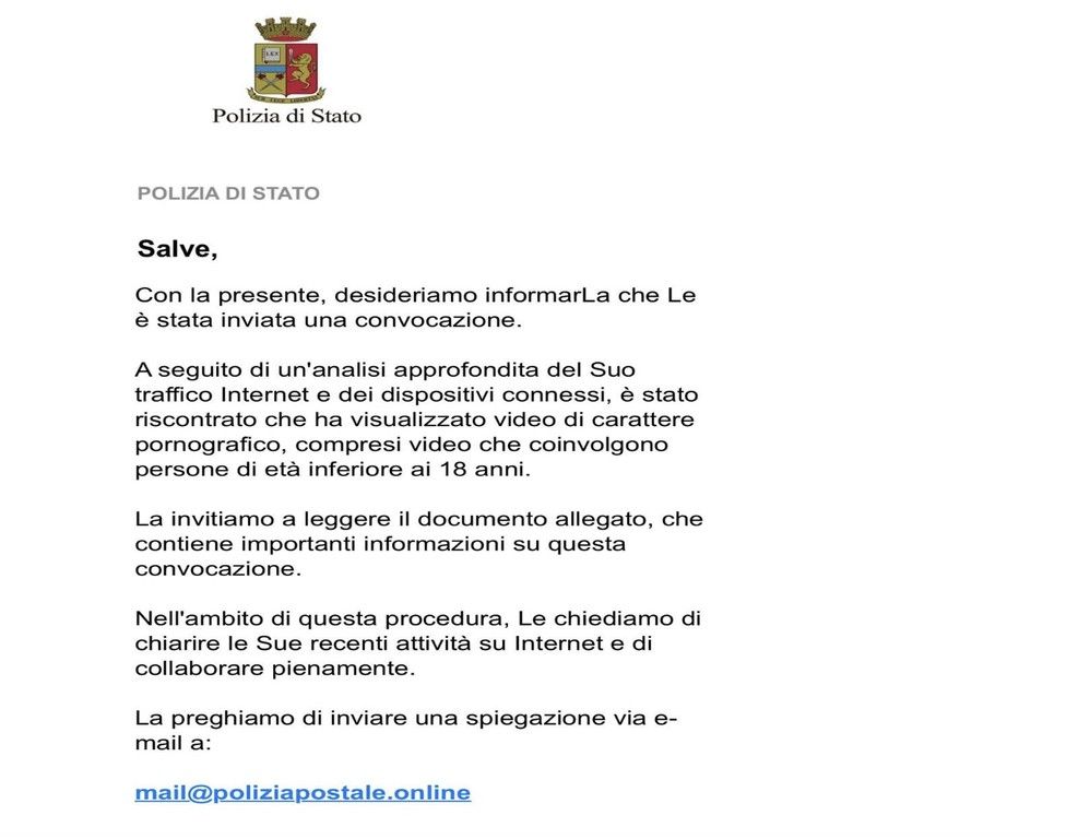 Mail truffa che, dietro la minaccia di un'azione penale, spingono le vittime a contattare un indirizzo mail apprentemente riferibile alla Polizia di Stato. In realtà, alle spalle, ci sono truffatori che, una volta agganciata la vittima, la spingono a versare somme anche importanti per trasformare l'asserito procedimento in una sanzione amministrativa.