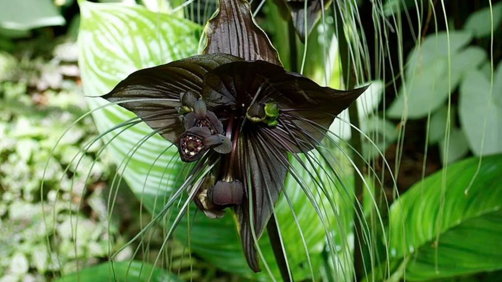 Nel sottobosco umido e buio delle foreste pluviali tropicali, questo fiore nero potrebbe essere scambiato per ali di pipistrello dotate di viticci simili a baffi.
