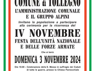 In questi giorni di festeggiamento di tutti i Santi e di particolare ricordo per i nostri defunti, l’Amministrazione comunale di Tollegno e il Gruppo Alpini del paese si sono uniti nel celebrare il IV Novembre, Festa dell’Unità nazionale e delle Forze Armate.