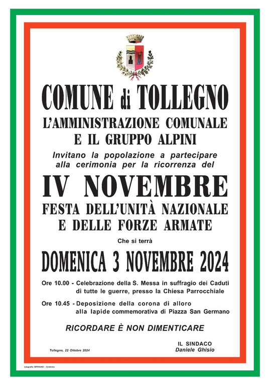 La cerimonia avrà luogo DOMENICA 3 NOVEMBRE, con inizio alle ore 10 con la celebrazione, presso la Chiesa Parrocchiale di San Germano, della S. Messa in suffragio dei Caduti di tutte le guerre. A seguire, alle 10.45, è prevista la deposizione di una corona di alloro alla lapide commemorativa di Piazza San Germano.
