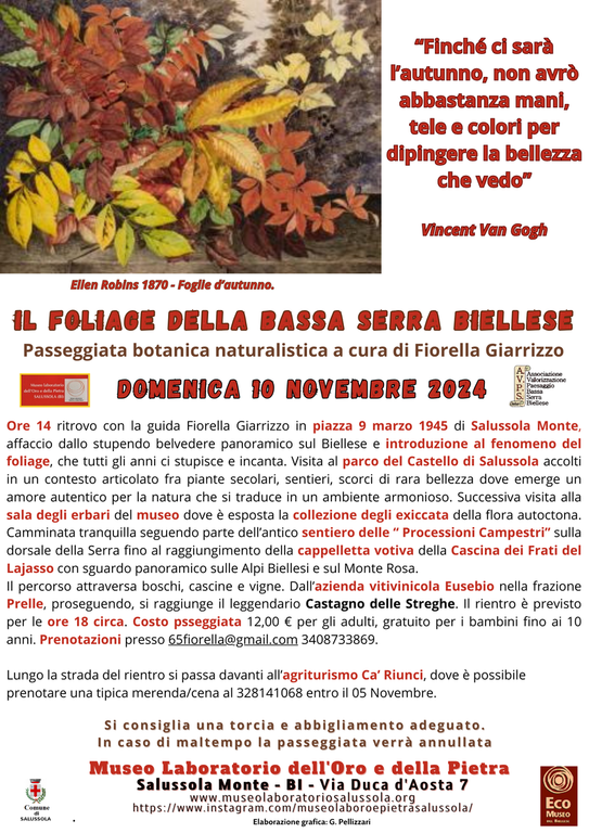 Alle 14 di domenica 10 novembre avrà luogo il ritrovo con la guida Fiorella Giarrizzo in piazza 9 marzo 1945 di Salussola Monte, affaccio dallo stupendo belvedere panoramico sul Biellese e introduzione al fenomeno del foliage, che tutti gli anni ci stupisce e incanta. Visita al parco del Castello di Salussola accolti in un contesto articolato fra piante secolari, sentieri, scorci di rara bellezza dove emerge un amore per la natura che si traduce in un ambiente armonioso. Successiva visita alla sala degli erbari del museo dove è esposta la collezione degli exiccata della flora autoctona. Si inizia una camminata tranquilla seguendo parte dell’antico sentiero delle “ Processioni Campestri” sulla dorsale della Serra fino al raggiungimento della cappelletta votiva della Cascina dei Frati del Lajasso con sguardo panoramico sulle Alpi Biellesi e sul Monte Rosa.