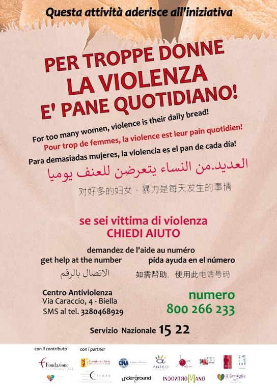 Se hai bisogno d’aiuto chiama il Centro antiviolenza con i riferimenti per i contatti” scritti in diverse lingue: italiano, inglese, francese, spagnolo, arabo e cinese è stampata su 15 mila sacchetti per il pane, che saranno distribuiti gratuitamente alle panetterie ed ai negozi di alimentari aderenti all’iniziativa sul territorio biellese, con l’intento di trasformare un gesto quotidiano e familiare come l’acquisto del pane in un momento di riflessione. Lo scopo è anche offrire uno strumento utile, sui sacchetti è infatti impresso anche l’indirizzo del Centro Antiviolenza di Biella, il numero per sms e il numero del Servizio nazionale al quale le donne in difficoltà possono rivolgersi per trovare supporto e assistenza. Il pane, infatti arriva ogni giorno sulle tavole delle famiglie, perciò utilizzare la sua catena di distribuzione costituisce un metodo efficace per pubblicizzare il numero del Centro antiviolenza e per operare una prima opportuna sensibilizzazione della popolazione sul tema della violenza e sui servizi offerti alle donne. La campagna dei sacchetti del pane permetterà di promuovere a livello provinciale campagne di informazione e sensibilizzazione sulle tematiche della violenza contro le donne, degli stereotipi di genere e delle pari opportunità, nonché dei servizi offerti alle donne che subiscono violenza.