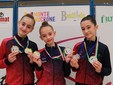 Ginevra Lanza in LB1 Allieve2 si classifica prima sia al cerchio che alle clavette, identico risultato con gli stessi attrezzi anche per Giorgia Maria Bonifacio fra le junior2. Alice Cola in LB2 conquista il primo posto a palla e nastro, mentre in LC1 allieve1 Ginevra Romanini è d’oro a fune e cerchio, stesso risultato anche per Ginevra Segatto fra le allieve2 negli attrezzi fune e nastro. Ginevra Viana, in gara in LC2 allieve2 è d’argento alla palla e di bronzo al nastro.