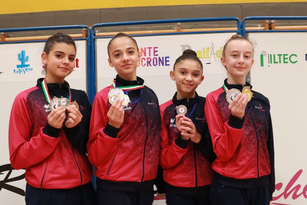 Ginevra Lanza in LB1 Allieve2 si classifica prima sia al cerchio che alle clavette, identico risultato con gli stessi attrezzi anche per Giorgia Maria Bonifacio fra le junior2. Alice Cola in LB2 conquista il primo posto a palla e nastro, mentre in LC1 allieve1 Ginevra Romanini è d’oro a fune e cerchio, stesso risultato anche per Ginevra Segatto fra le allieve2 negli attrezzi fune e nastro. Ginevra Viana, in gara in LC2 allieve2 è d’argento alla palla e di bronzo al nastro.