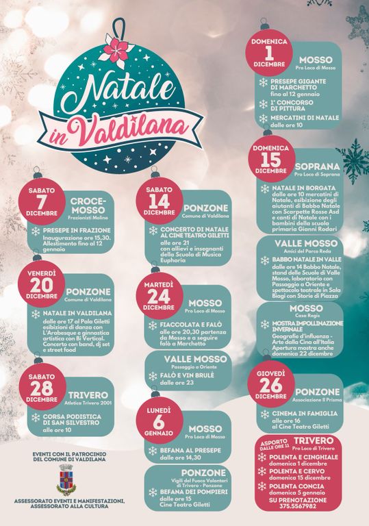 Grazie alla collaborazione tra associazioni, Pro Loco, scuole e realtà locali, “Natale in Valdilana” diventa molto più di una semplice celebrazione: è il frutto di un impegno corale, che ha visto lavorare fianco a fianco persone ed enti con l’obiettivo di regalare momenti speciali a tutta la comunità e a tutti coloro che avremo il piacere di ospitare. Gli eventi proposti spaziano tra cultura, spettacolo e tradizione, riflettendo l’impegno congiunto di tutte le comunità e dei territori del comune, che hanno contribuito con passione e creatività per rendere unico ogni appuntamento.