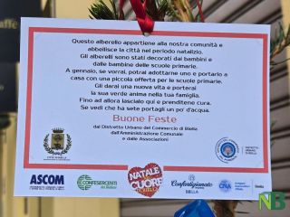 In cima ad ogni albero, compresi quelli che sono stati messi in piazza XXV Aprile che saranno addobbati dai bimbi delle elementari del quartiere di Chiavazza in questi giorni, c'è un messaggio chiaro che spiega il progetto: "Questo albero appartiene alla nostra comunità, abbellisce la città nel periodo natalizio. E' stato decorato dai bambini delle elementari e se vorrai potrai adottarlo e portarlo a casa con una piccola offerta per la scuola. Gli darai nuova vita e porterai la sua anima verde anima nella tua famiglia. Fino ad allora lascialo qui e prenditene cura, se vedi che ha sete portagli un po' di acqua".