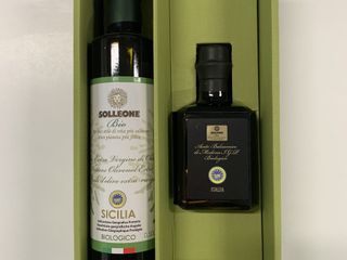 - Box condimenti: 1 bottiglia di olio IGP Sicilia BIO da 500 ml e 1 bottiglia di aceto balsamico di Modena IGP da 250ml.
