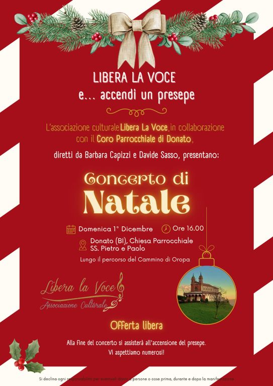 L'Associazione Culturale "Libera la Voce", in collaborazione con il Coro Parrocchiale di Donato, invita tutti a partecipare al Concerto di Natale, in programma per domenica 1° dicembre alle ore 16.00, presso la Chiesa Parrocchiale dei Santi Pietro e Paolo a Donato.