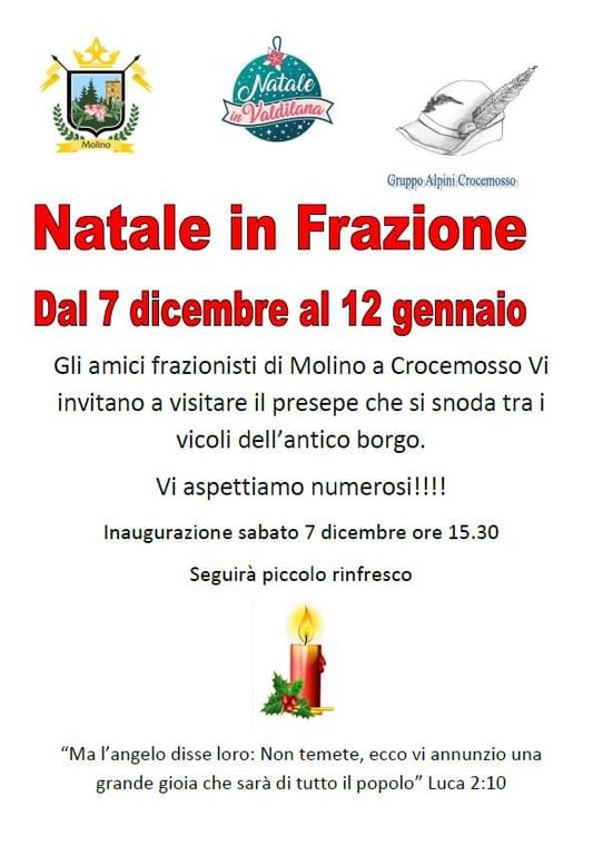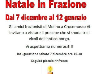 Il borgo antico di Crocemosso ospiterà dal 7 dicembre al 12 gennaio il suggestivo presepe natalizio. Gli amici frazionisti di Molino vi invitano a non perdere l’inaugurazione del presepe e il rinfresco, che si terranno sabato 7 dicembre alle ore 15.30.