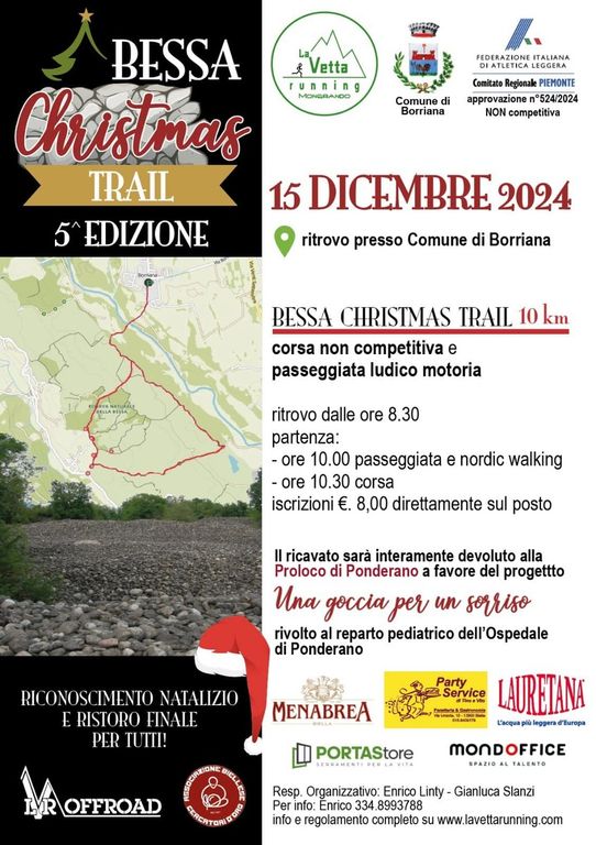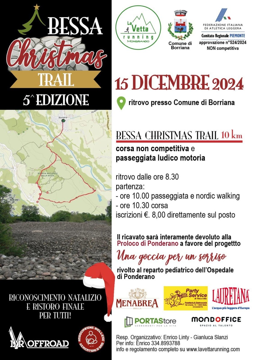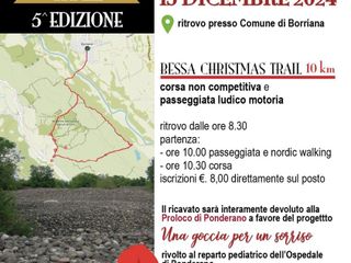 Sempre domenica 15 ci sarà a Borriana la Bessa Christmas trail 10 Km. Si tratta di una corsa non competitiva e passeggiata ludico motoria. Il ritrovo è alle 8, e alle 10 ci sarà la partenza della passeggiata mentre alle 10,30 la partenza della corsa. Il ricavato della corsa organizzata da La Vetta Running sarà interamente devoluto alla pro loco di Ponderano a favore del progetto "Una Goccia per un sorriso". La partenza e l’arrivo dell’evento saranno da Borriana in Piazza Don Guido Gariazzo (Area cortilizia all'interno del Comune).