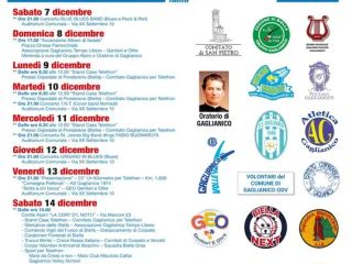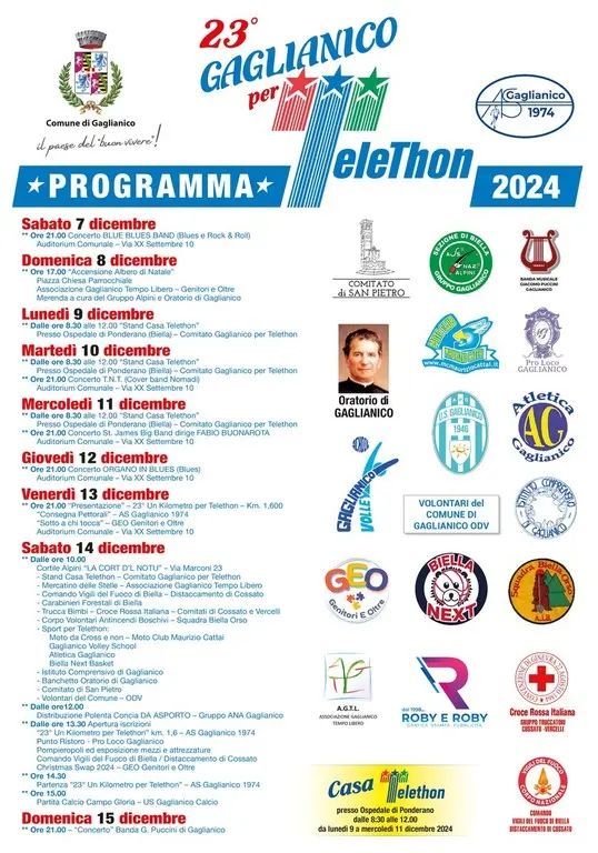 A Gaglianico sabato 14 dicembre è in calendario 24^ Un chilometro per Telethon. Alle 13,30 ci sarà l'apertura delle iscrizioni di 1,6 Km organizzata da As Gaglianico 1974. La partenza sarà alle 14,30.