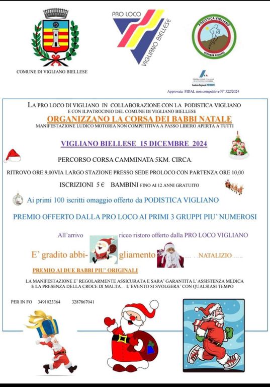 Domenica 15 ci sono invece due corse, una a Vigliano e una a Borriana. A Vigliano la pro loco di Vigliano in collaborazione con la Podistica Vigliano organizza la corsa dei Babbi Natale. il percorso corsa-camminata è di 5km circa. Il ritrovo è alle 9 in via Largo Stazione presso la sede della pro loco e la partenza sarà alle 10.