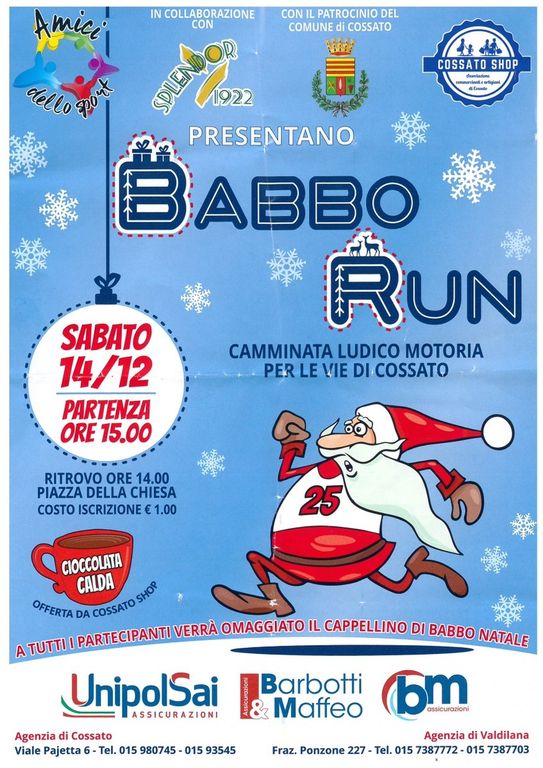 A Cossato sabato alle 15 ci sarà la Babbo Run, una camminata ludico motoria per le vie di Cossato. Il ritrovo è alle 14 in piazza della chiesa. L'evento è organizzato dagli Amici dello Sport in collaborazione con lo Splendor 1922.