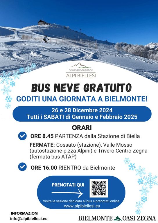 Dopo il successo del primo anno torna a grande richiesta, anche per la stagione invernale 2024-2025, il servizio bus gratuito che unisce Biella a Bielmonte organizzato dal Consorzio Turistico Alpi Biellesi. Iniziativa pensata per ridurre l'utilizzo di mezzi privati sul territorio e garantire un servizio turistico che colleghi la città di Biella alle montagne dell'Oasi.
