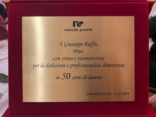 E l'azienda Ramella Graniti lo sa bene, ed è per questo che ha consegnato al suo dipendente Giuseppe Ruffa, una targa come ringraziamento per aver dedicato tutto se stesso con tanta dedizione ed eccellenza.