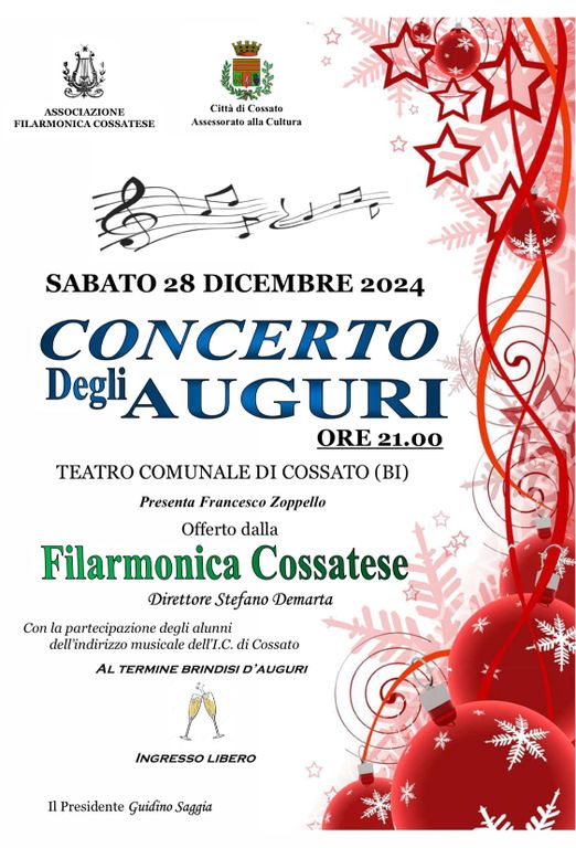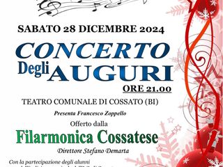 A Cossato è tutto pronto per il Concerto degli Auguri. Si tratta del tradizionale appuntamento di fine anno con la Filarmonica Cossatese, che vedrà anche la partecipazione degli studenti frequentanti l'indirizzo musicale dell'Istituto Comprensivo di Cossato.