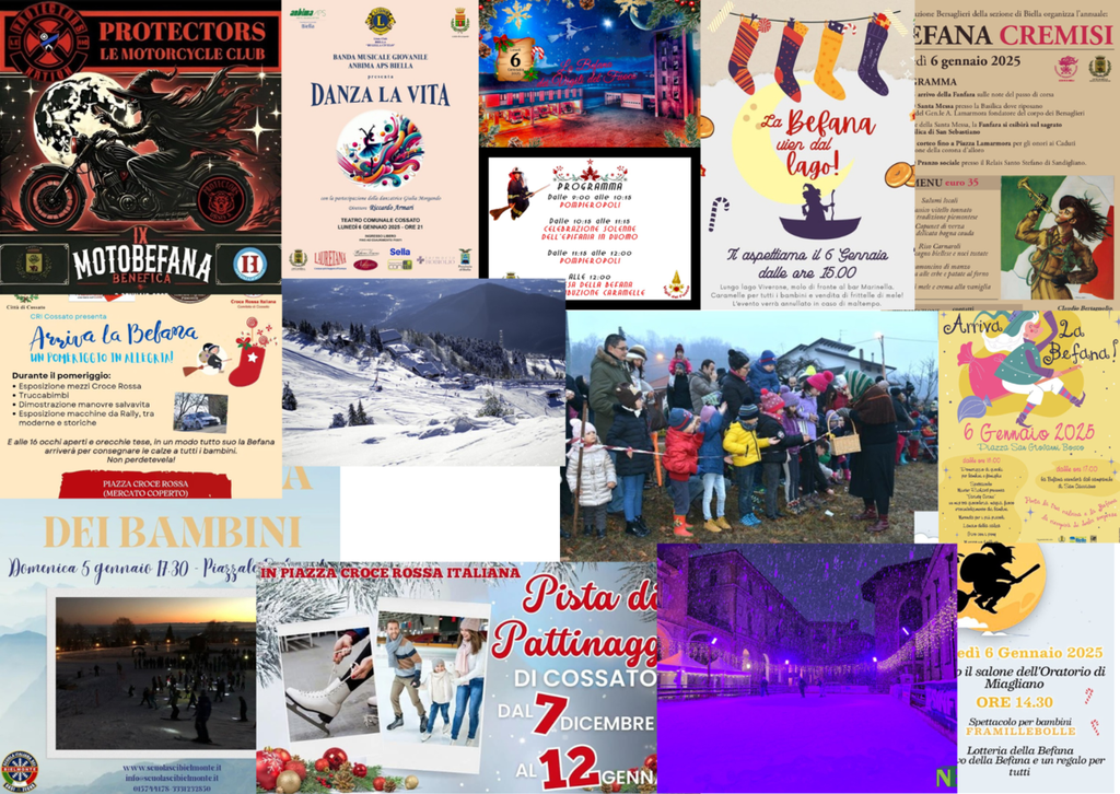 - Biella, Befana Cremisi, alle 10.15 arriva la Fanfara, alle 10,30 c'è la Santa Messa a San Sebastiano, segue il corteo fino a Piazza Lamarmora.