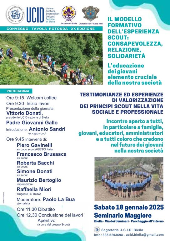 "Il modello formativo dell'esperienza scout", è il titolo del convegno in programma sabato 18 a Biella, in via Seminari organizzato da UCID Biella.