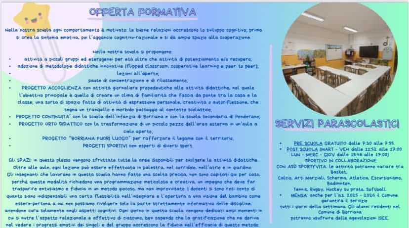 Lunedì 13 gennaio dalle ore 17 alle 19 ci sarà un nuovo open day della scuola elementare di Borriana P. G. Frassati.