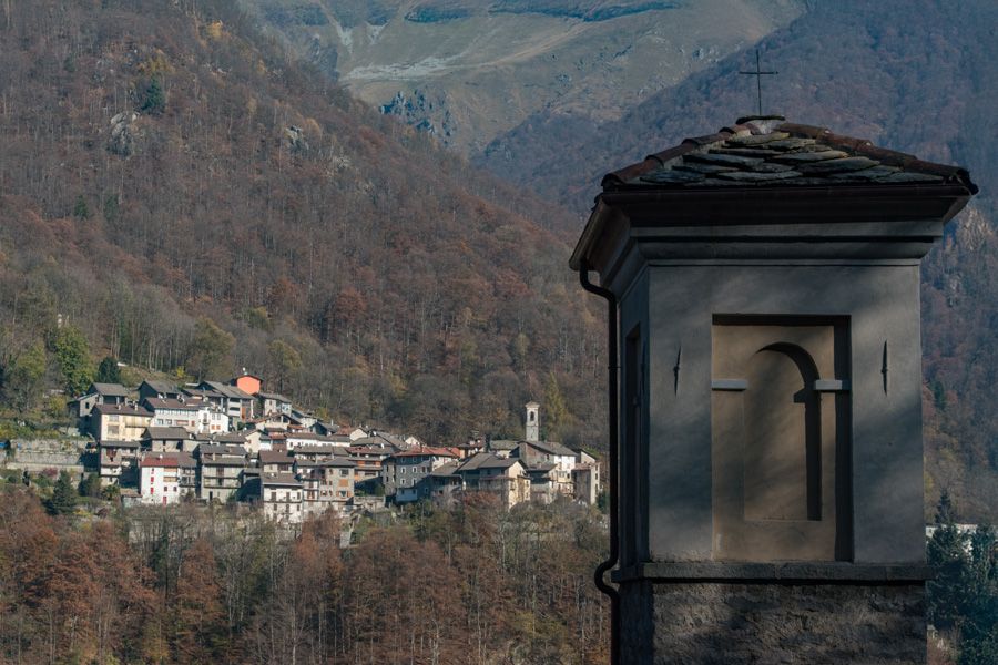 Utilizzo dello zoom con diaframma chiuso per avere a fuoco sia il campanile che la frazione dall’altra parte della valle.