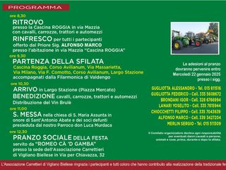 L'appuntamento è alle 8,30 dove al momento dei ritrovo verrà offerta la colazione del nuovo priore, quindi alle 9,30 ci sarà la partenza della sfilata di carrozze, cavalli e trattori che da Cascina Roggia percorrerà Corso Avilianum, Via Massarietta, Via Milano, Via F. Comotto, Corso Avilianum per arrivare in Largo Stazione accompagnati dalla Filarmonica di Valdengo. All'arrivo alle 10,30 circa ci sarà la benedizione, quindi la Santa Messa nella chiesa di S. Maria Assunta in onore di Sant'Antonio Abate e dei soci defunti presieduta dal Parroco don Luca Murdaca e il pranzo sociale che verrà servito da “ROMEO CÀ ’D GAMBA” presso la sede dell'Associazione Carrettieri di Vigliano Biellese in Via per Chiavazza, 32.