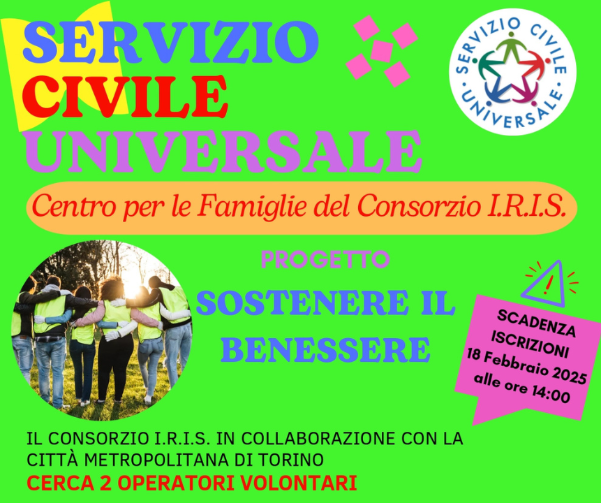 Il Consorzio I.R.I.S., in collaborazione con la Città Metropolitana di Torino, è alla ricerca di due giovani volontari per il progetto di Servizio Civile “Sostenere il Benessere”.