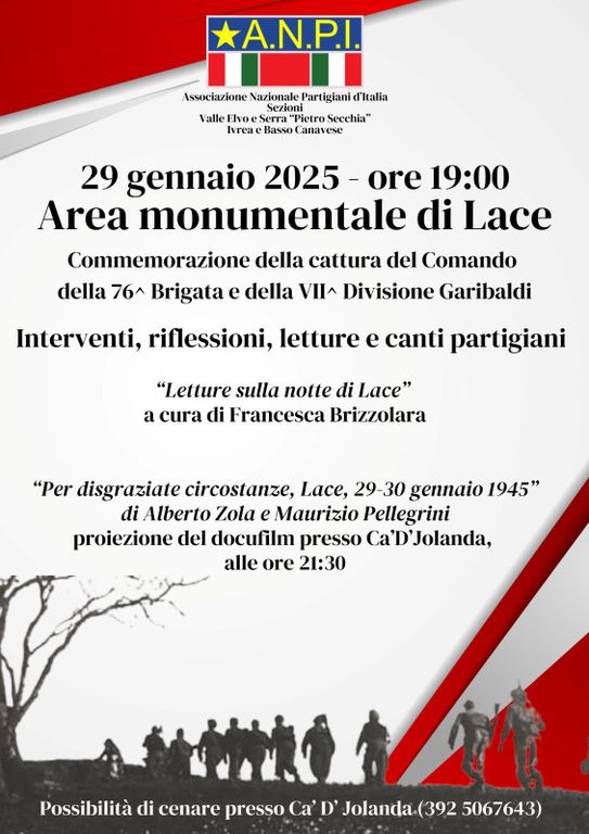 Anche quest’anno, le sezioni ANPI di Ivrea e Basso Canavese, insieme a quella di Valle Elvo e Serra, organizzano una commemorazione presso l’Area Monumentale di Lace, frazione di Donato, un luogo carico di memoria e significato storico. L’evento, che si terrà il 29 gennaio 2025, ricorda i tragici fatti avvenuti 80 anni fa, quando il Comando partigiano della 76ª Brigata della VII Divisione Garibaldi fu sorpreso dai nazisti nella baita che sorgeva in quell’area.