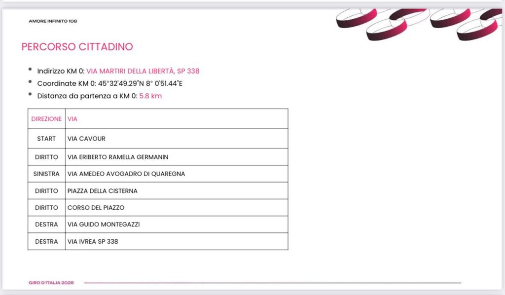 Sono pervenute le prime informazioni riguardanti le aree della 19ma tappa del Giro d’Italia, che partirà da Biella il 30 maggio 2025. Il Podio Firma sarà in piazza Martiri della Libertà. Il Villaggio Commerciale degli sponsor verrà ubicato in piazza Colonnetti. La tappa avrà la partenza in via Cavour all’altezza della rotonda con al centro il monumento Uomo Bike di Paolo Barichello. I corridori proseguiranno per via Ramella Germanin, per poi salire verso il Piazzo in via Avogadro, piazza Cisterna e corso del Piazzo, si scenderà in via Mentegazzi, per poi prendere via Ivrea, che condurrà la carovana verso il prosieguo della tappa.
