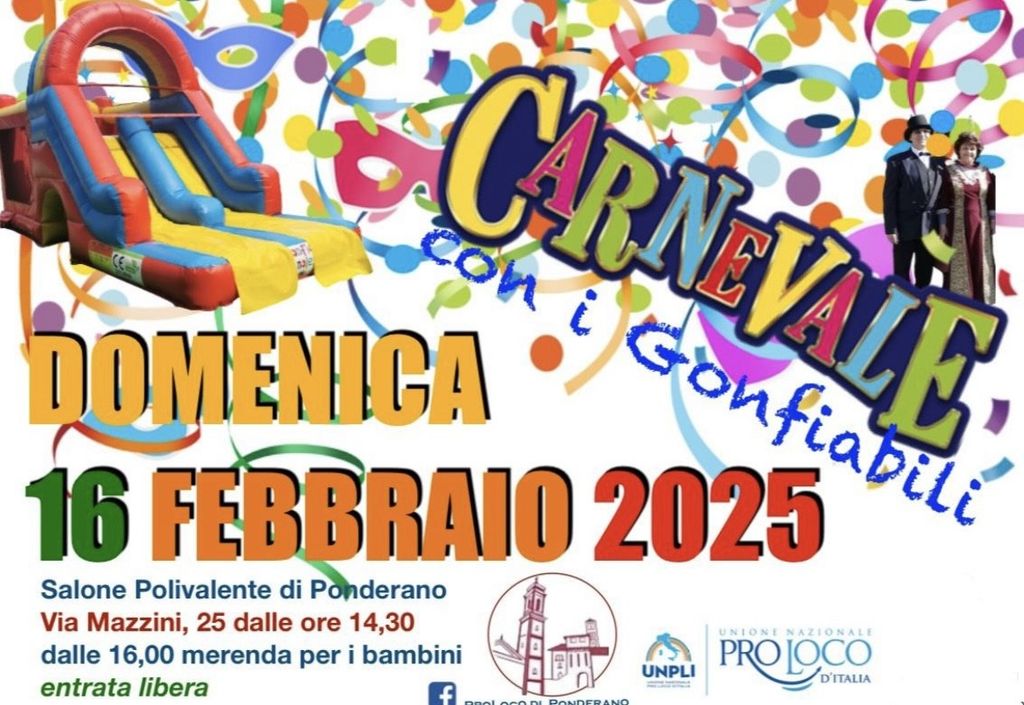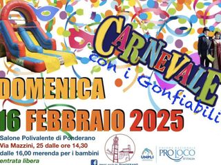 Domenica 16 febbraio il primo appuntamento: il carnevale per i più piccini; presso il polivalente in via Mazzini 27. Ci saranno i giochi gonfiabili, appuntamento che si ripete ogni anno ideato per fa trascorrere qualche ora di puro divertimento in un ambiente caldo e accogliente. Alle ore 16 merenda offerta dagli organizzatori a tutti i partecipanti. Entrata libera.
