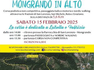A Mongrando sabato 15 febbraio c'è in calendario la "Mongrando in Alto", alla 10° edizione, con un percorso di 5,6km conosciuta anche come laCorsaDelleTorte. Organizzata da La Vetta Running in collaborazione con la Parrocchia San Lorenzo di Mongrando, ha un costo di € 6 e l'iscrizione è sul posto il giorno della gara. RITROVO: dalle ore 14:00 presso la parrocchia di San Lorenzo a Mongrando PARTENZA: ore 15:00 PASSEGGIATA E NORDIC WALKING, ore 15:30. Responsabile Organizzativo: Linty Enrico cell. 334 899 3788. Info: sul sito della società www.lavettarunning.com