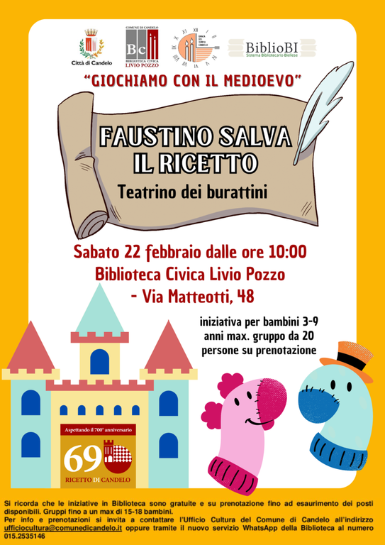 Il Ricetto di Candelo è in pericolo: i briganti vogliono assaltarlo e portare via tutto ciò che è conservato nelle cantine dai contadini del luogo. Ma Faustino ha un'idea! Chi è Faustino? Lo scoprirete venendo in biblioteca sabato 22 febbraio alle 10.