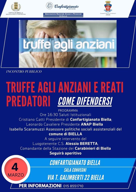 L’ANAP Biella, Associazione Pensionati Confartigianato Biella, promuove un incontro aperto ai pensionati biellesi per prevenire le truffe agli anziani. L’appuntamento è fissato per il 4 marzo alle ore 16:30, presso la sede di Biella in via Galimberti 22.