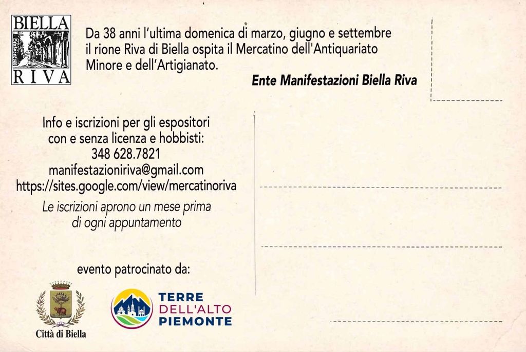 Torna l’appuntamento dedicato agli appassionati di cose d'altri tempi. Da 38 anni l'ultima domenica dei mesi di marzo, giugno e settembre il Rione di Biella Riva ospita espositori provenienti da tutto il Piemonte, dalla Valle d’Aosta e dalla Lombardia .