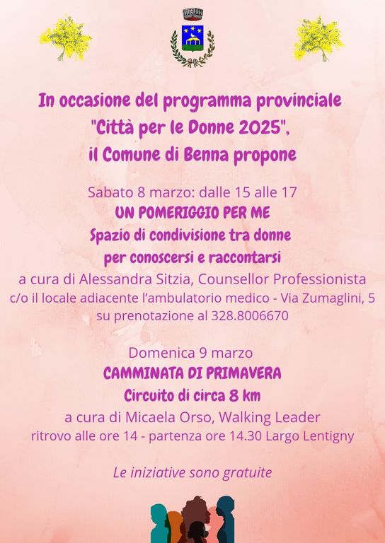 Domenica 9 marzo, invece, si terrà la "Camminata di primavera", un percorso di circa 8 km condotto da Micaela Orso, walking leader e conduttrice del gruppo di cammino di Benna.