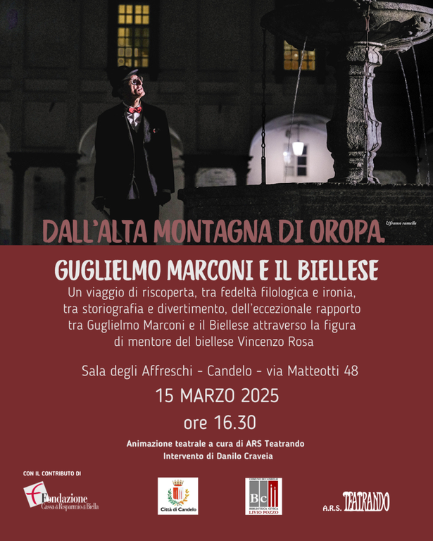 Prosegue il tour della conferenza-spettacolo “Dall’alta montagna di Oropa – Guglielmo Marconi e il Biellese”, che esplora con ironia e rigore storico il legame tra il celebre inventore e il territorio biellese. L’evento si terrà sabato 15 marzo alle ore 16.30 nella Sala degli Affreschi di Candelo.