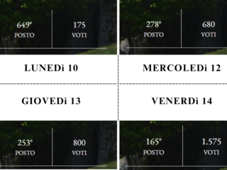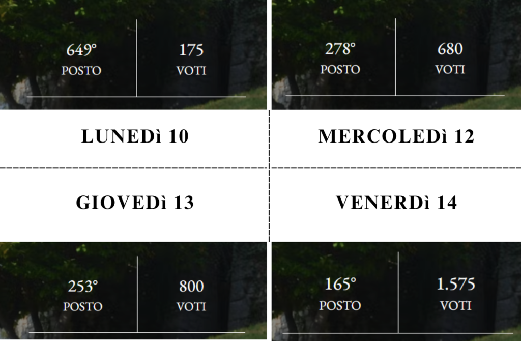 175 erano le attenzioni rivolte alla Riserva Naturale del Brich situata fra Ronco Biellese e Zumaglia, ma a seguito del rinnovato impegno la collina dell’arte ha subito una brusca e positiva variazione di rotta. A partire da lunedì 10 marzo, la votazione immobile ha cominciato ad aumentare significativamente, raggiungendo in poche ore valori doppi rispetto al precedente punteggio e, da quel giorno, non sembrano voler rallentare… Oggi ha oltrepassato i 1600 voti e si trova, a partire da ieri venerdì 14 marzo, in 2a posizione sulla classifica territoriale.