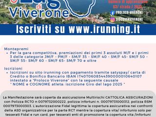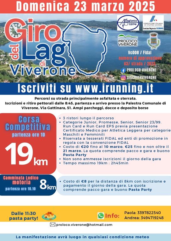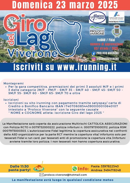 Sempre domenica 23 marzo a Viverone c'è Il Giro del Lago di Viverone. Percorsi su strada principalmente asfaltata e sterrata. Iscrizioni e ritiro pettorali dalle 8:45, partenza e arrivo presso la Palestra Comunale di Viverone, Via Gattinara, 51. Ampi parcheggi, docce e deposito borse. Due i percorsi proposti, una corsa competitiva con partenza alle 10 di 19Km, e una camminata ludico motoria di 8Km con partenza alle 10.10. Per info Paola: 3397822540 Andrea: 3494719248 . La manifestazione avrà luogo in qualsiasi condizione meteo. Iscriviti su www.irunning.it con pagamento tramite satyspay/ carta di Credito o Bonifico Bancario IBAN IT40T0608544390000010640107 intestato a “Proloco Viverone” con la seguente causale “ NOME e COGNOME atleta: iscrizione Giro del lago 2025 “