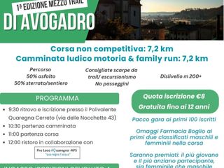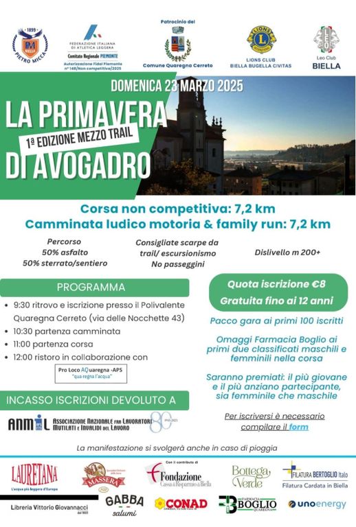 A Quaregna Cerreto domenica 23 marzo si corre per la Primavera di Avogadro 1° edizione mezzo trail. Sono previste una corsa non competitiva di 7,2 Km e una camminata ludico motoria e family run sempre di 7,2 Km. Il dislivello è di 200 mt. Il ritrovo è alle 9,30 al Polivalente alle 10.30 ci sarà la partenza della camminata, e alle 11,30 la partenza della corsa. L'incasso delle iscrizioni sarà devoluto a AMNIL. "La primavera di Avogadro" è organizzata dall'associazione Pietro Micca e dalla Federazione Italiana di Atletica Leggera con il supporto del Lions Club Biella Bugella Civitas e del Leo Club, e con il patrocinio del Comune di Quaregna Cerreto.