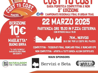 A Biella sabato 22 marzo c'è la Biella Piazzo Cost to Cost, 2^ edizione campionato regionale urban trail 1^ prova trofeo ecopiemonte Fidal 2025 e camminata ludico motoria. La partenza è alle ore 15.00 in p.zza Cisterna con ritrovo dalle 13. Iscrizioni dal 15 febbraio al 19 Marzo ONline iscriviti sul sito di i-running. Responsabile organizzatore Giuseppe Mello Rella - 331 3004159, Responsabile as Gaglianico Cappio Alberto - 339 7123903. La corsa è organizzata da Gli Amici del Piazzo in collaborazione con as Gaglianico 1974.