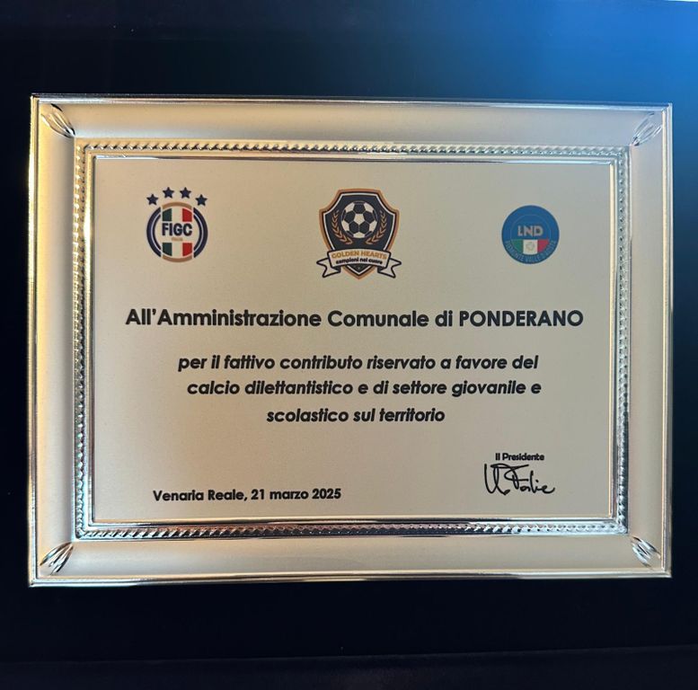 In qualità di Sindaco, è con grande lusinga e orgoglio che ricevo un'importante riconoscenza per la nostra Amministrazione. Durante la cerimonia, il presidente del CR Piemonte Valle D'Aosta FIGC-LND, Mauro Foschia, ha consegnato una targa “all'Amministrazione Comunale di Ponderano”. Questo riconoscimento celebra l'impegno costante che mettiamo nel sostenere lo sport dilettantistico e scolastico. Sono stati realizzati numerosi interventi durante il nostro mandato elettorale, tutti mirati a promuovere e valorizzare le attività sportive e sociali sul nostro territorio.
